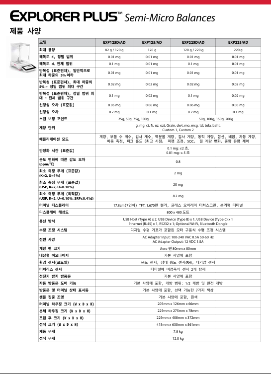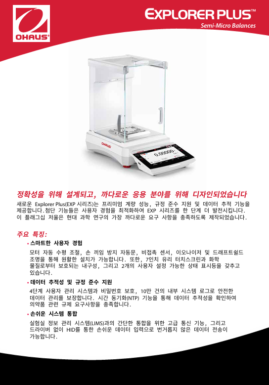 새로운 Explorer EXP 시리즈는 프리미엄 계량 성능, 규정 준수 지원, 데이터 추적 기능을 제공합니다. 첨단 기능으로 사용을 최적화해 EXP의 가치를 한 단계 높였습니다. 이 플래그십 밸런스는 현대 과학 연구의 가장 까다로운 요구를 충족하도록 설계되었습니다.