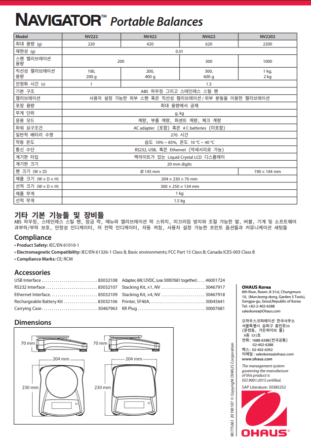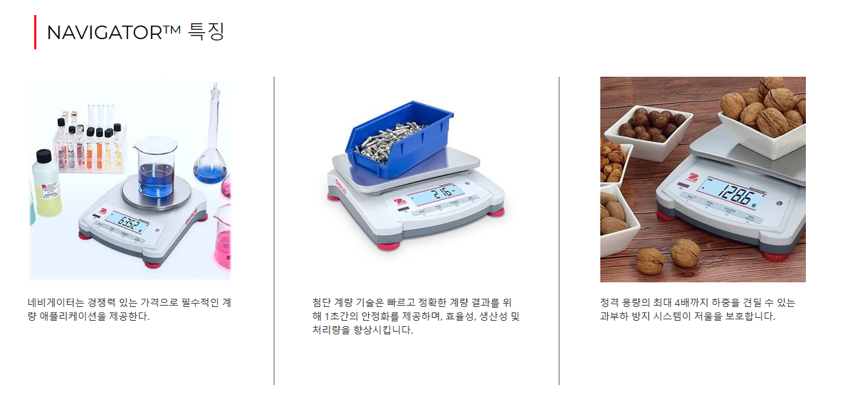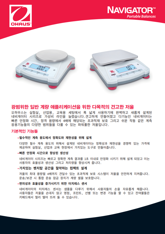 매일 계측에 적합한 다목적 휴대용 저울 OHAUS는 실험실, 산업현장, 교육용 세팅의 일반적인 계측 애플리케이션에 완벽하게 디자인 된 Navigator 시리즈로 가성비 라인의 비율을 높였습니다.