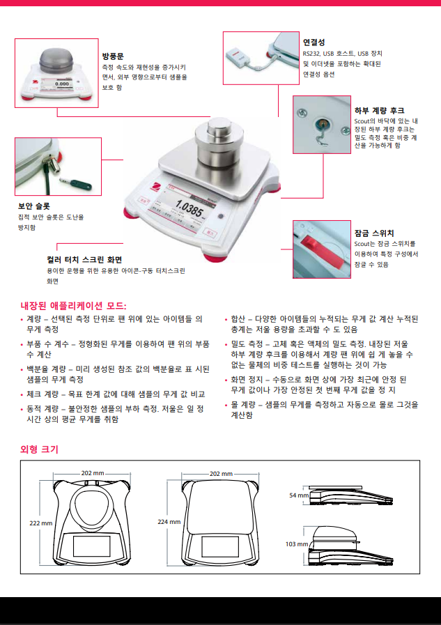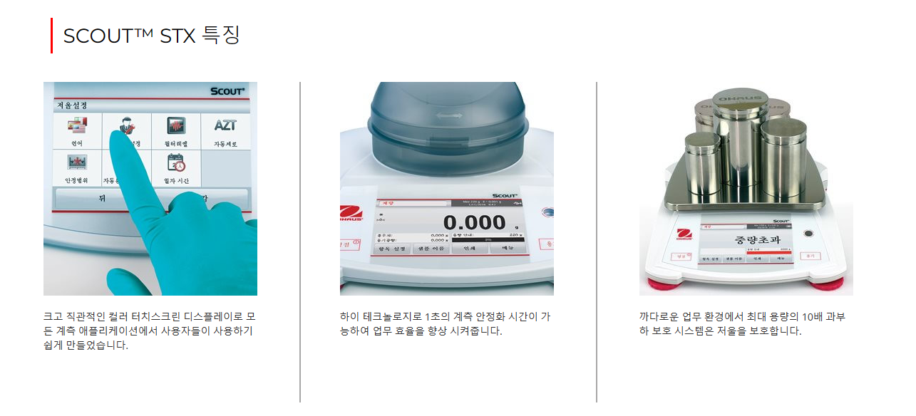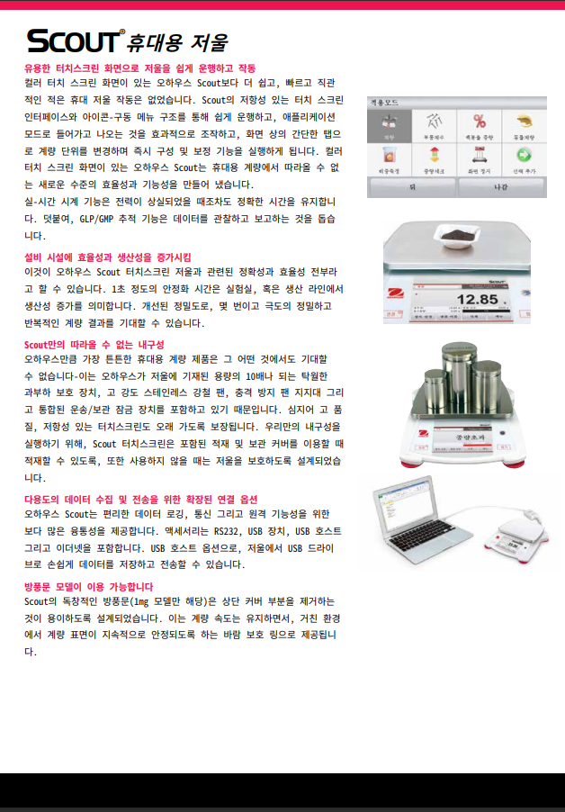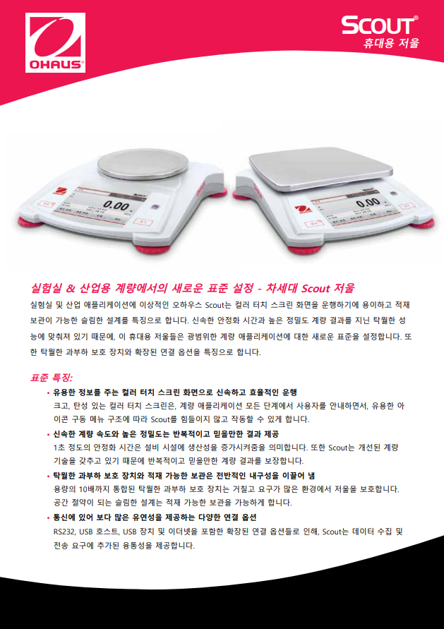 업무의 높은 정확성과 효율 향상을 위한 직관적인 터치 스크린으로 높은 퍼포먼스를 보여주는 휴대용 정밀 저울 실험실과 산업용에 적합한 오하우스 스카우트는 컬러 터치스크린 탐색이 용이하고 슬림한 디자인으로 다단적치 보관이 가능하다. 빠른 안정화 시간과 고해상도 계량결과를 보장하는 보다 다양한 계량범위로 새로운 기준을 제시한다. 우수한 과부하 보호와 확장된 연결옵션 등의 특징을 가지고 있다.