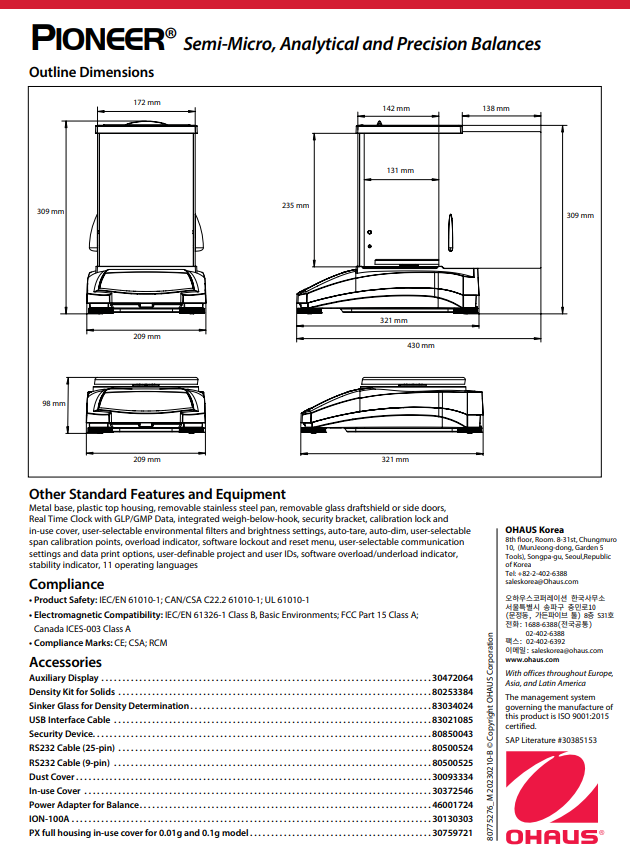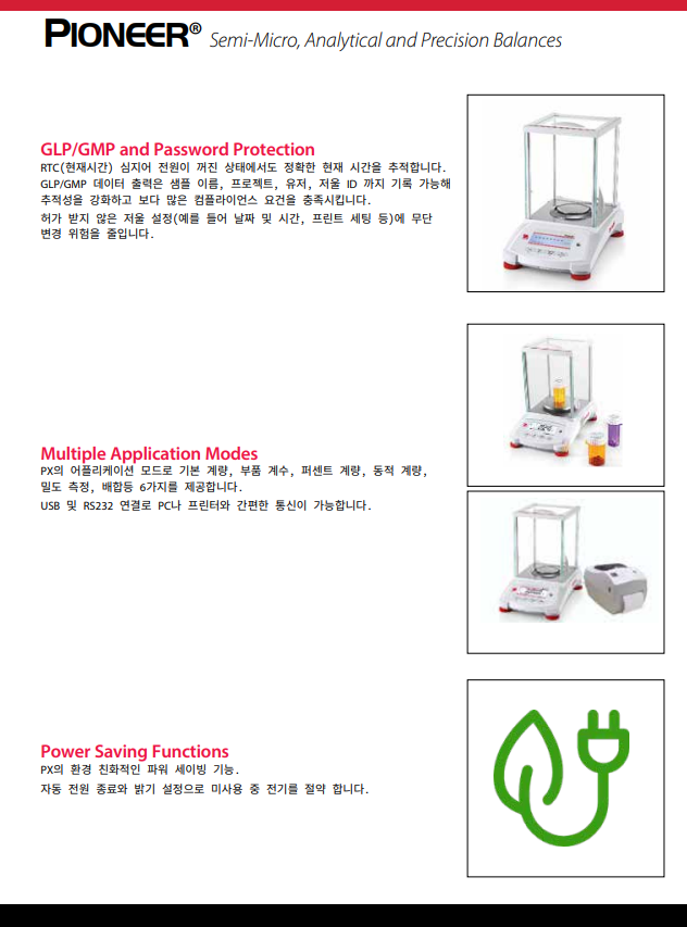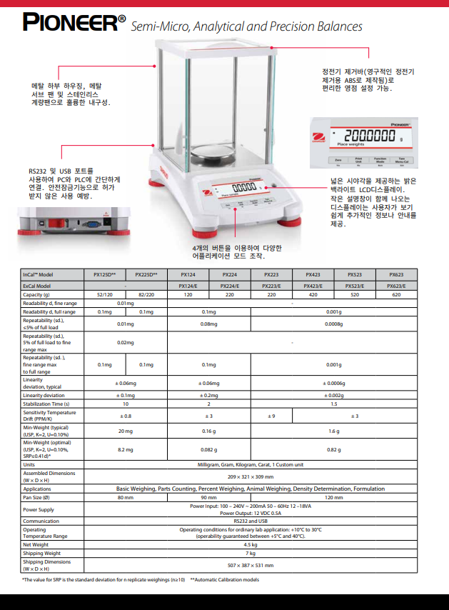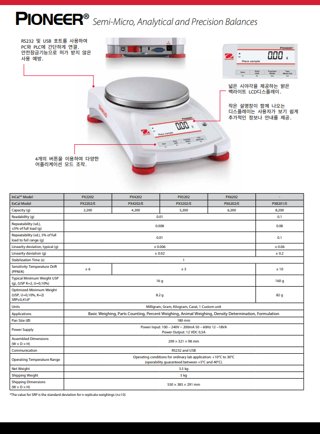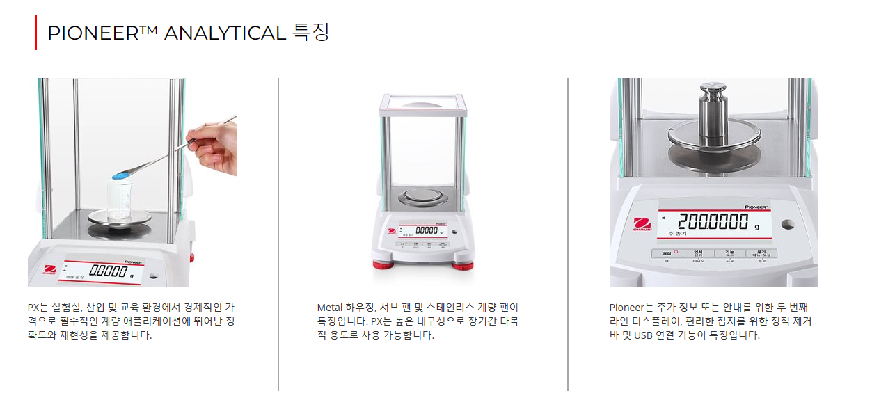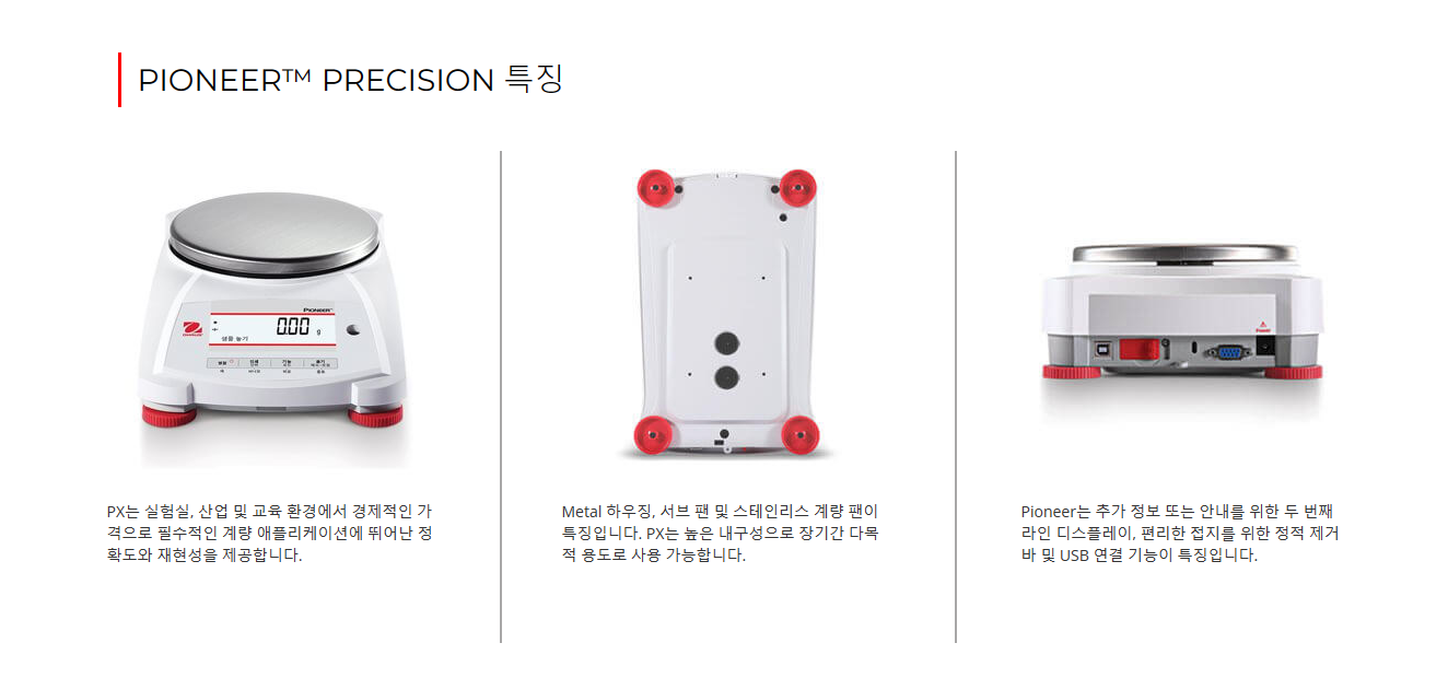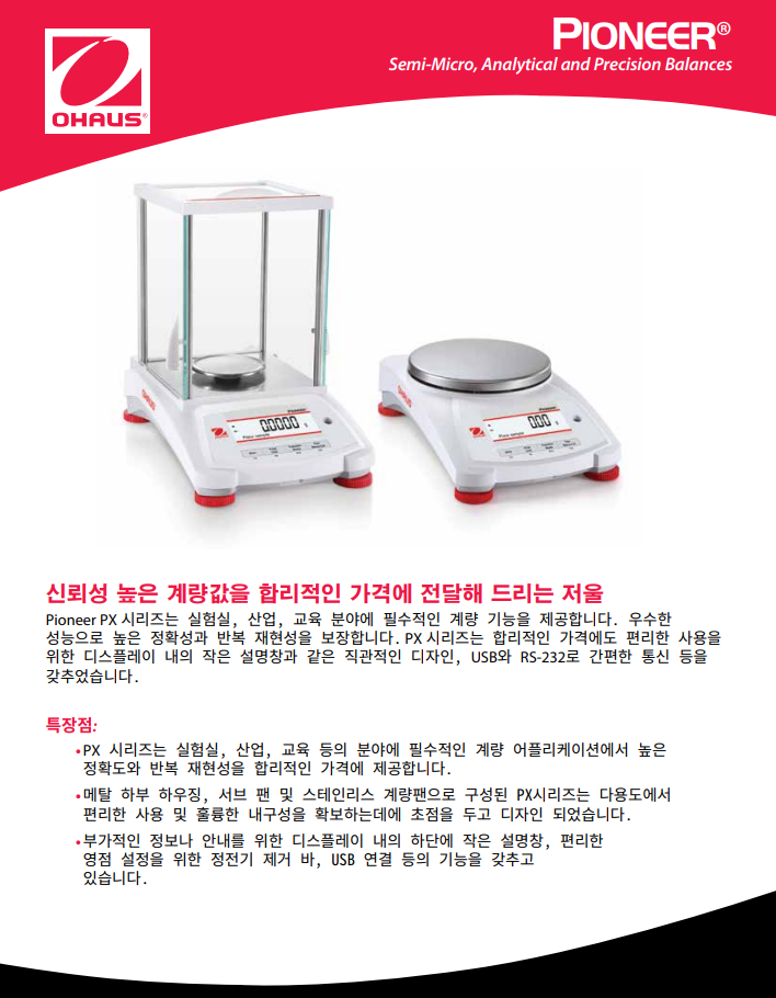Pioneer PX series는 필수적인 무게 측정 기능과 경쟁력 있는 성능을 결합하여 실험실, 산업 및 교육 환경에서 애플리케이션에 높은 정확도와 반복 재현성을 제공합니다. PX는 합리적인 가격에 추가 정보를 위해 보조 중량 디스플레이와 함께 지능현 작업을 위해 직관적으로 설계되었으며, 통신을 위해 USB 및 RS232 연결이 가능합니다.