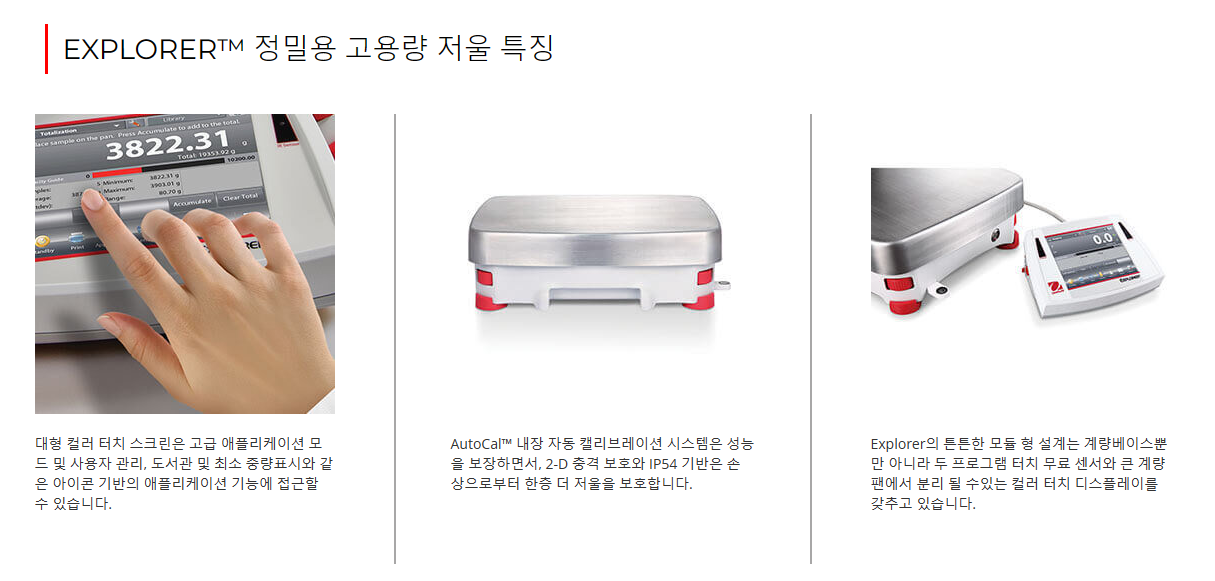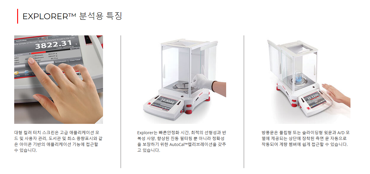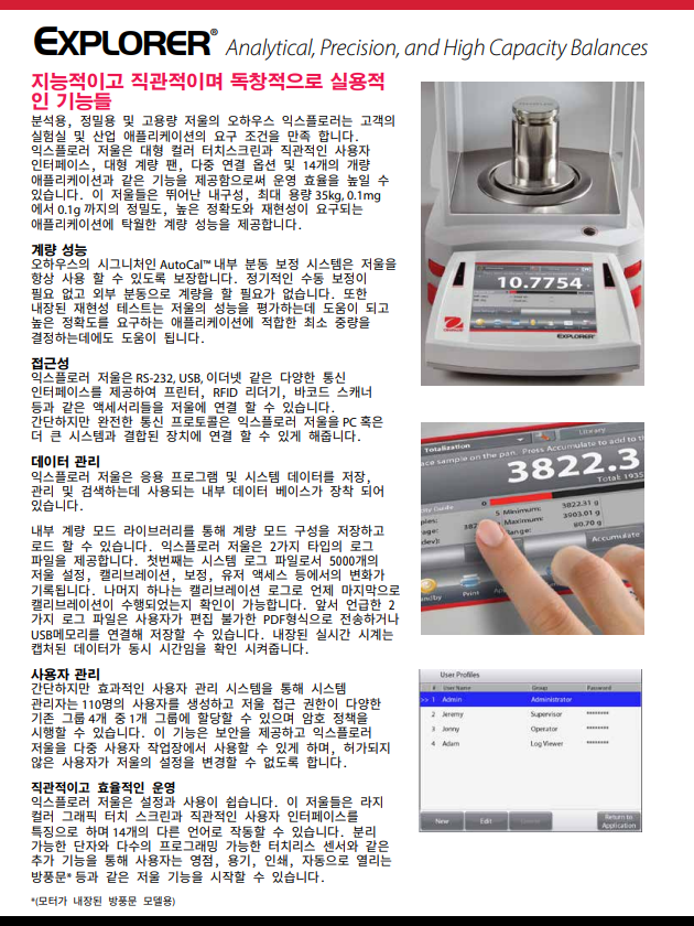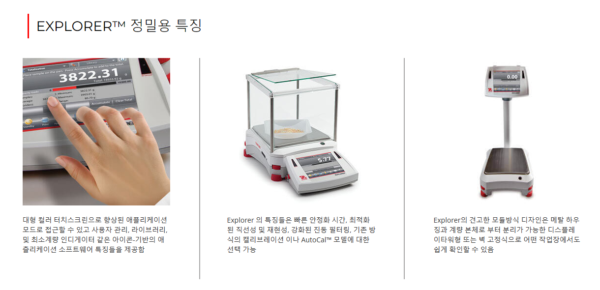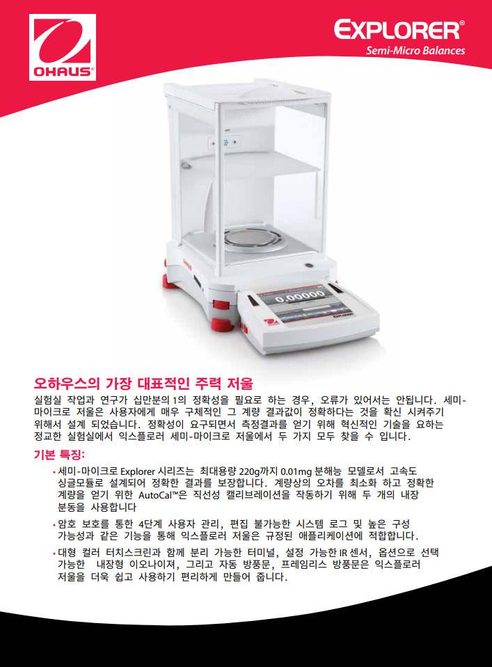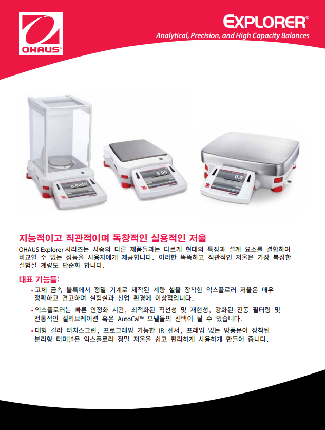 오하우스 Explorer™ 시리즈는 시장에서 다른 어떤 제품과 달리 고-성능 저울 급에서 비교할 수 없는 기능을 제공하는 현대적 기능과 디자인을 확장함으로써 그 독창성으로 한 단계 올라섰습니다. 이러한 스마트하고 직관적인 저울과 그 지적인 특징들은 가장 복잡한 실험용 측정에서 조차 단순화하였습니다.
