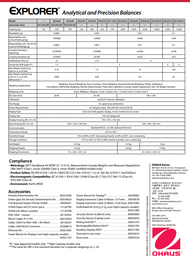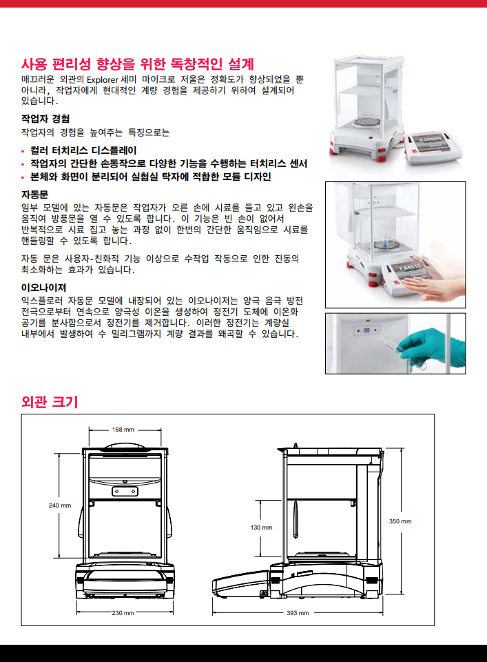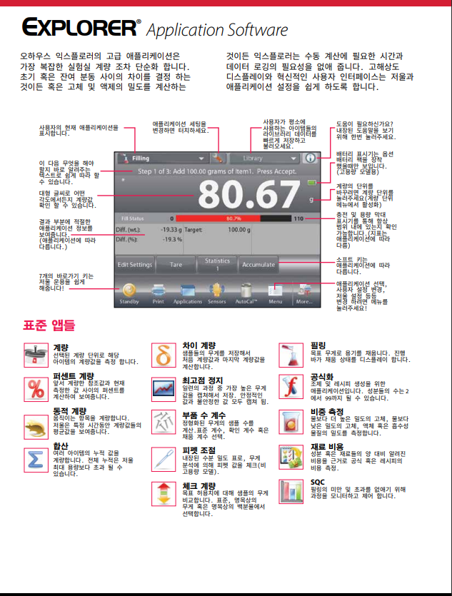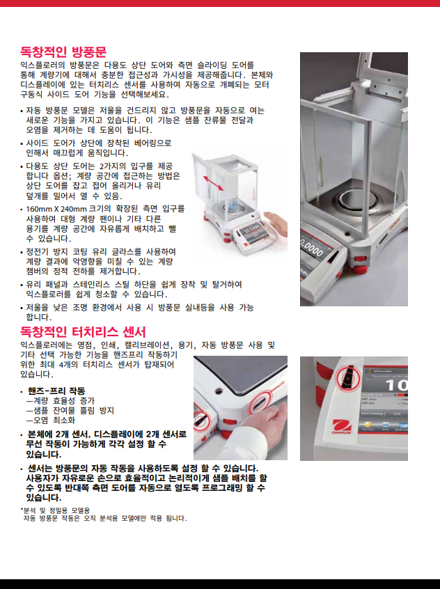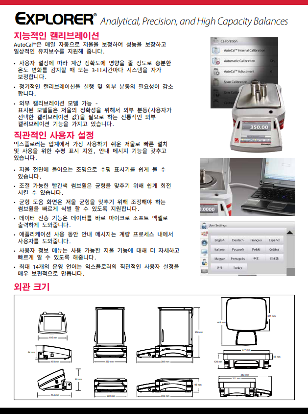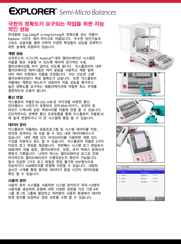오하우스 Explorer™ 시리즈는 시장에서 다른 어떤 제품과 달리 고-성능 저울 급에서 비교할 수 없는 기능을 제공하는 현대적 기능과 디자인을 확장함으로써 그 독창성으로 한 단계 올라섰습니다. 이러한 스마트하고 직관적인 저울과 그 지적인 특징들은 가장 복잡한 실험용 측정에서 조차 단순화하였습니다.