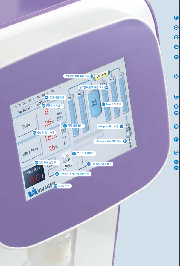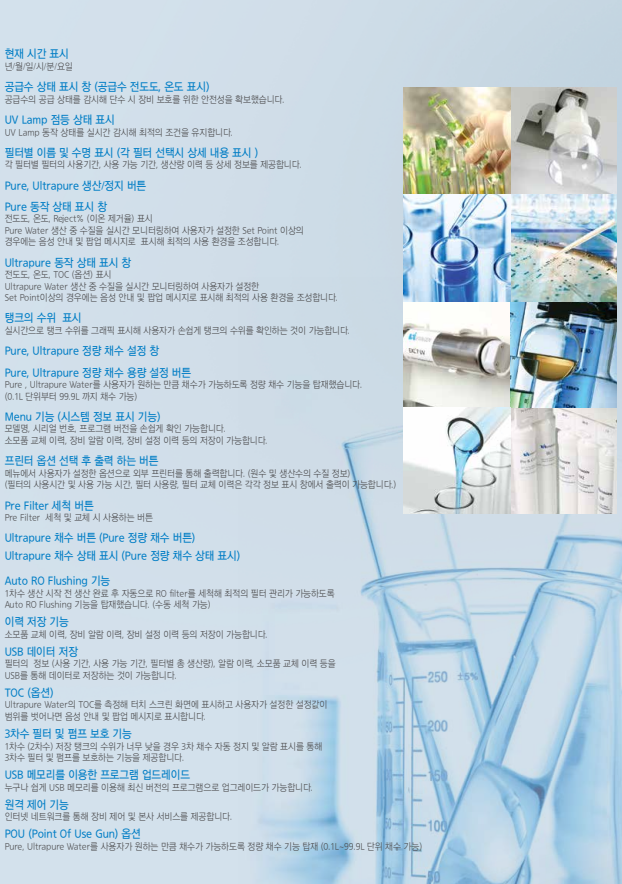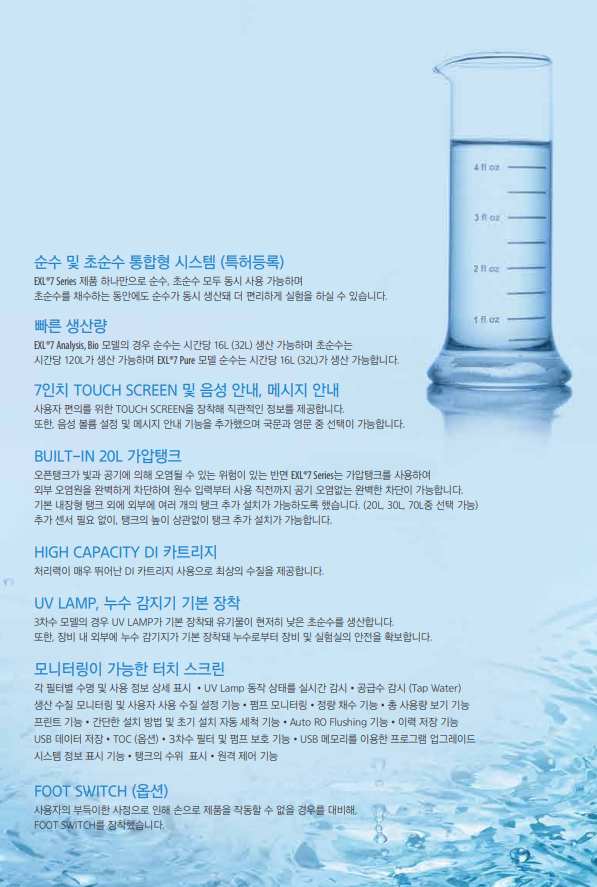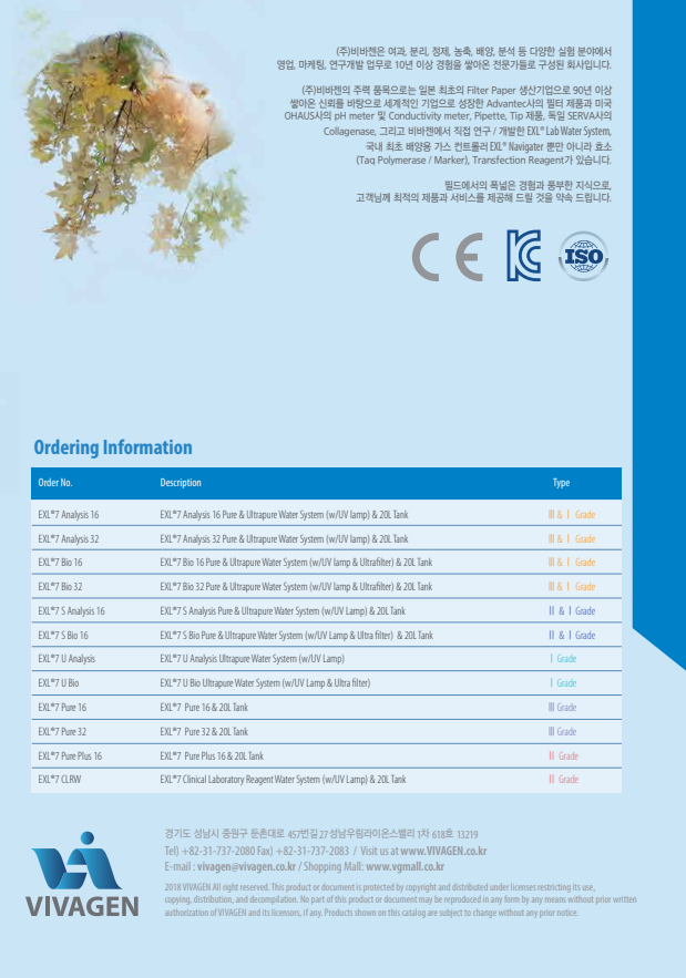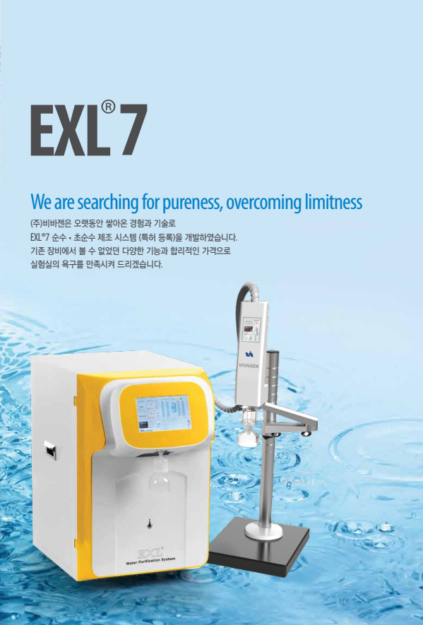 (주)비바젠은 오랫동안 쌓아온 경험과 기술로 EXL®7 순수•초순수 제조 시스템 (특허 등록)을 개발하였습니다. 기존 장비에서 볼 수 없었던 다양한 기능과 합리적인 가격으로 실험실의 욕구를 만족시켜 드리겠습니다.