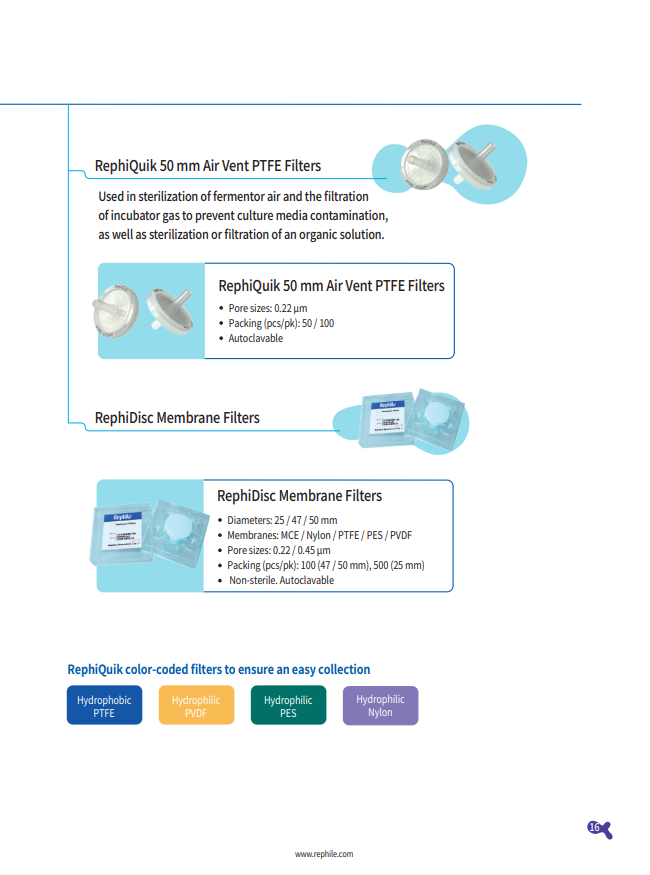 RephiDisc 멤브레인 필터는 MCE, 나일론, PTFE, PES 및 PVDF와 같은 다양한 재질로 제공됩니다.