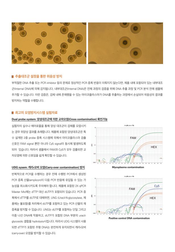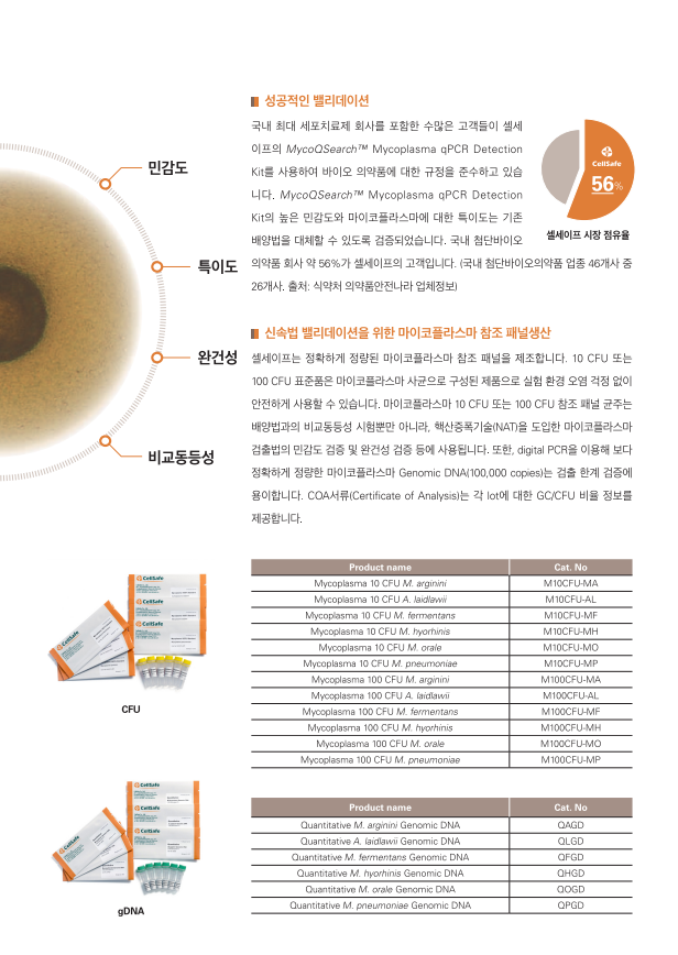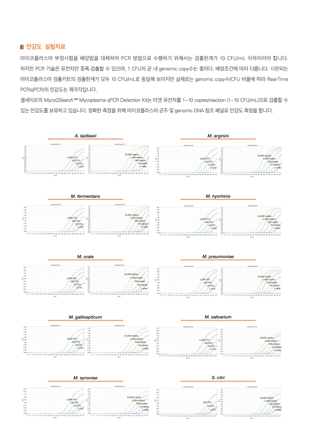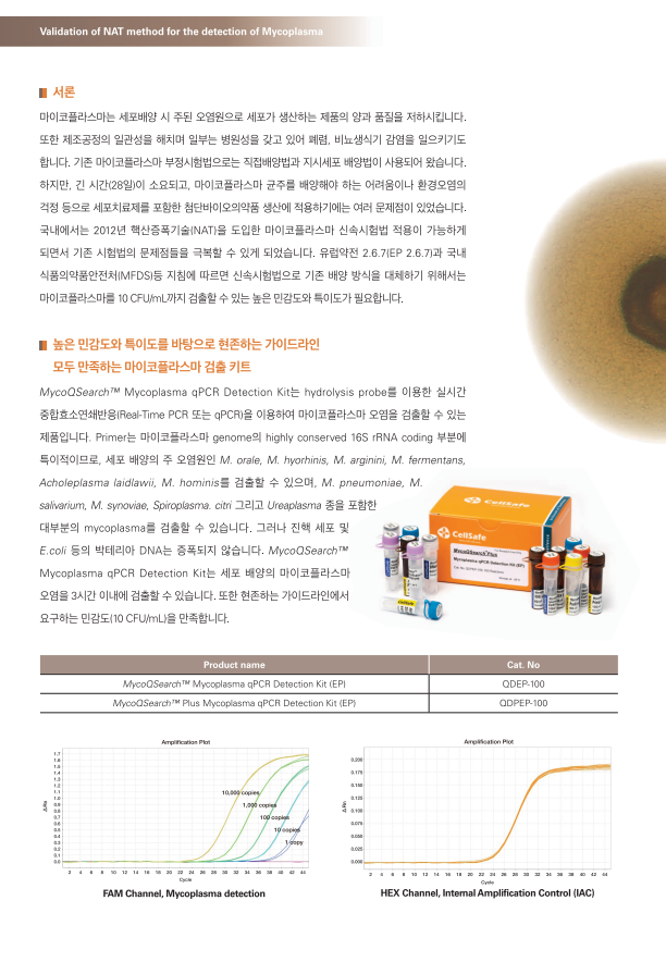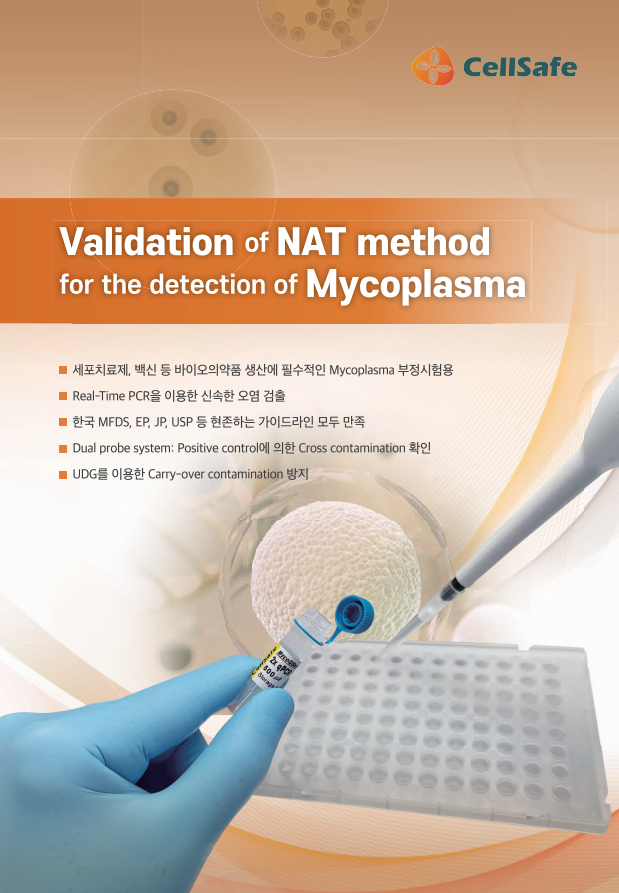 · 생물학적 마이코플라스마 및 생산 세포 균주의 마이코플라스마 오염에 대한 검증 제품 · M. orale, M. hyorhinis, M. arginini, M. fermentans, M. hominis, Acholeplasma laidlawii를 포함한 세포 배양의 주요 오염 물질을 함유하여 M. pneumoniae, M. salivarium, M. genitalium, M. penentrans 및 ureaplasma의 모든 마이코플라스마 검출 가능 · 프라이머는 고도로 보존된 16s rRNA 코딩 영역에 결합합니다. · 진핵생물 및 기타 박테리아 종의 DNA는 검출되지 않습니다. · PCR 성능 모니터링은 내부 증폭 제어(IAC)의 적용으로 가능합니다. · 간편한 사용을 위해 최적화된 PCR 프리믹스 제공 · TaqMan 프로브 방법을 사용하여 Real-Time PCR(qPCR) 기법 적용 (FAM 표지 프로브: 마이코플라즈마, HEX 표지 프로브: IAC) · 세포 배양 용액 또는 상용 DNA 추출 키트를 사용한 주요 가닥 DNA 준비 · 감도 : 1 ~ 10 fg / 반응 · 1-2시간 이내 결과 확인 · 한국 식품의약품안전처(MFDS), 유럽약전(EP), 일본약전(JP) 규격 통과 · UDG 시스템 적용: 캐리오버 오염 방지