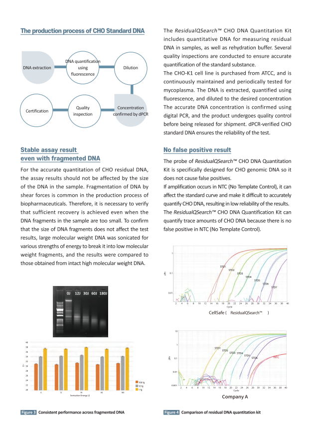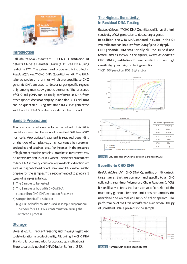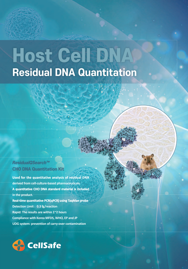 CellSafe ResidualQSearch™ CHO DNA 정량 분석 키트는 Real-Time PCR을 사용하여 중국 햄스터 난소(CHO) 세포 DNA를 검출합니다. 프라이머 및 프로브 혼합물은 ResidualQSearch™ CHO DNA 정량 분석 키트에 포함되어 있습니다. CHO 게놈 DNA에 특이적인 FAM 표지 프로브 및 프라이머는 다중 복제 유전 요소 중 표적 특이적 영역만 검출하는 데 사용됩니다. CHO 세포 gDNA의 존재는 다른 종의 DNA가 증폭되지 않기 때문에 쉽게 확인할 수 있습니다. 또한 본 제품에 포함된 CHO DNA 표준물질로 생성된 표준 곡선을 사용하여 CHO 세포 DNA를 정량화할 수 있습니다.