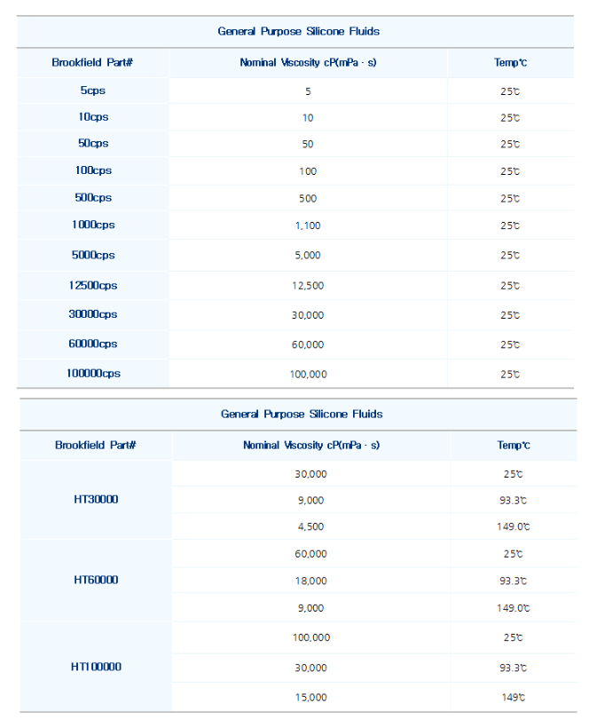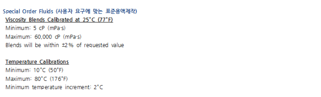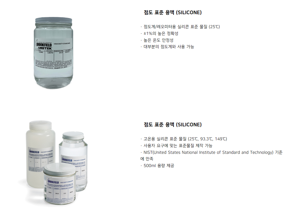대부분의 점도계 또는 레오미터의 Calibration 상태 및 기기 이상 유무를 점검하는 목적으로 사용됩니다. Brookfield 점도 표준 용액은 인체에 무해한 무독성 실리콘 용액으로서, ±1%의 정확도를 나타냅니다. 사용자 요구에 따라 고온용이나 원하는 점도 또는 원하는 온도에서의 표준 물질을 구매 할 수 있습니다. 사용자가 원하는 표준액 점도의 주문 제작이 가능하고, 국내 외 많은 인증기관에서 브룩필드 점도계의 검교정, 이상 유무 점검 등을 위해 사용됩니다.