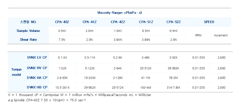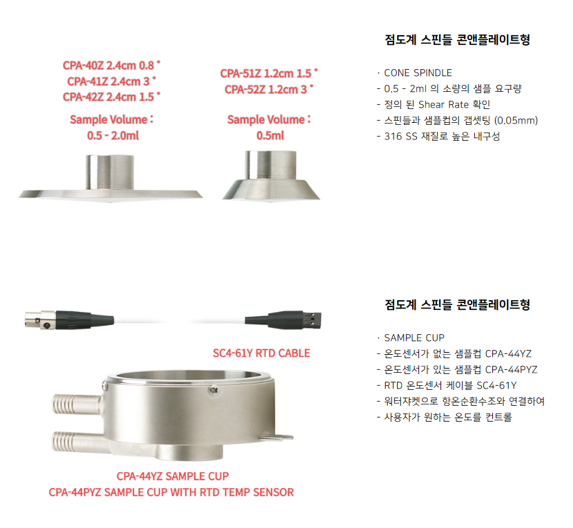 VISCOMETER CONE SPINDLES BROOKFIELD CONE&PLATE 점도계 모든 모델과 호환 가능하며, LV, RV, HA, HB 토크모델에 따라 구분됩니다. 스핀들의 교차 사용은 불가능 합니다. (실린더형 스핀들 장착 불가) 스핀들의 점도 범위는 점도계에 입력하는 RPM에 따라 달라 집니다. 전용 샘플컵을 사용하여, Defined 된 샘플량이 요구되며 Shear Rate와 Shear Stress 확인이 가능 합니다.