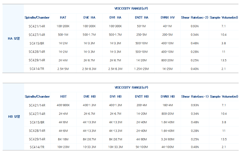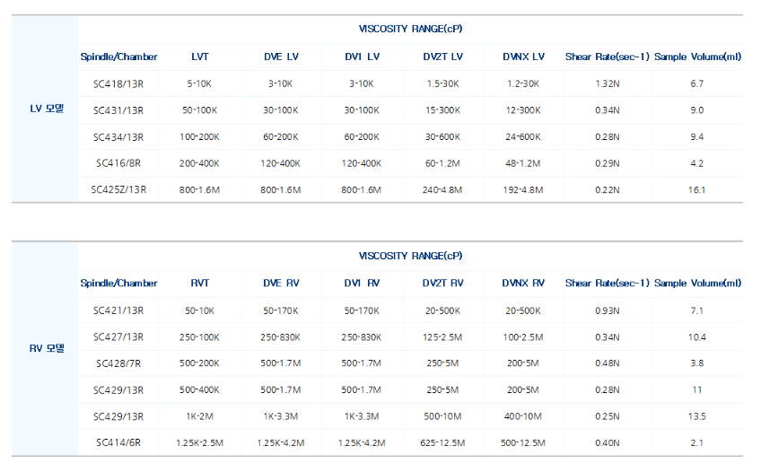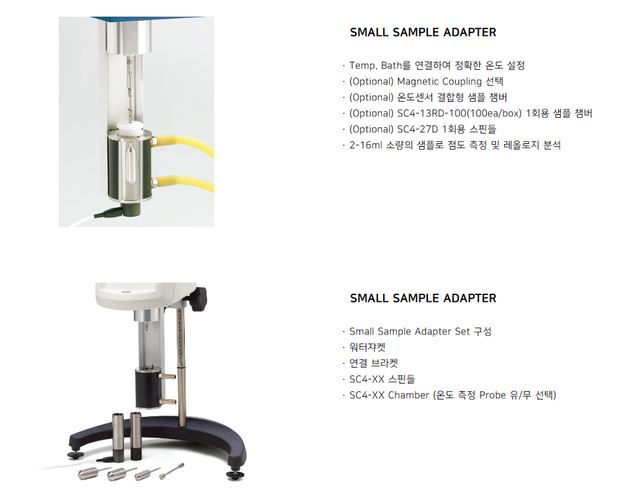 SMALL SAMPLE ADAPTER 2-16ml의 비교적 적은 양의 샘플로 점도를 측정하고 사용자의 목적에 맞는 점도 범위에 따라 스핀들 선택이 가능합니다. 스핀들마다 전용 샘플을 사용하여 Shear Rate/Stress 확인이 가능합니다. Brookfield 점도계 구형, 신형 모두 상관없이 장착이 가능하며 304SUS 재질로 내부식성에 강한 점도 측정 악세서리 입니다.