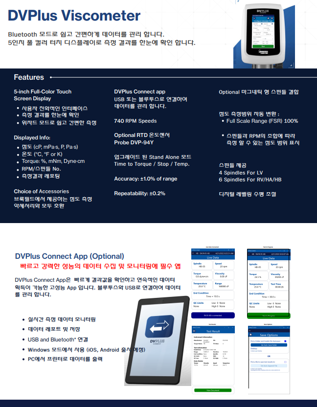 Brookfield 사의 점도측정 악세서리인 UL Adapter_(저점도측정 전용), Small Sample Adapter_(소량 샘플측정 전용), Helipath_(비유동성 물질측정 전용), TC-Bath_(외부 항온조) 등과 모두 연결 가능하며, DVPlus app을 통해 데이터 관리가 가능합니다.