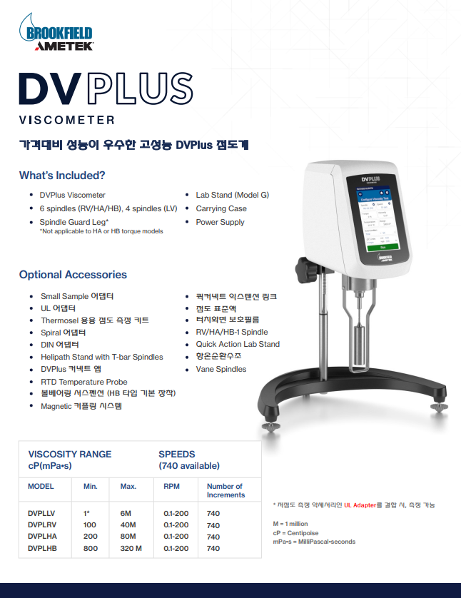 Brookfield 사의 DVPlus Viscometer는 사용이 간편하고 가격대비 성능이 우수한 점도측정장비입니다. 5 인치로 더 넓어진 터치디스플레이 화면으로 실험자가 원하는 데이터를 한눈에 확인 할 수 있습니다. 단종 된, DVE, DV1M 모델의 후속 모델로 가격대비 성능이 우수한 경제적인 점도계입니다. Thread형 스핀들과 Magnetic형 스핀들 장착으로 사용자 편의성에 중점을 두었으며, 브룩필드용 점도 측정 악세서리와 호환 가능합니다.