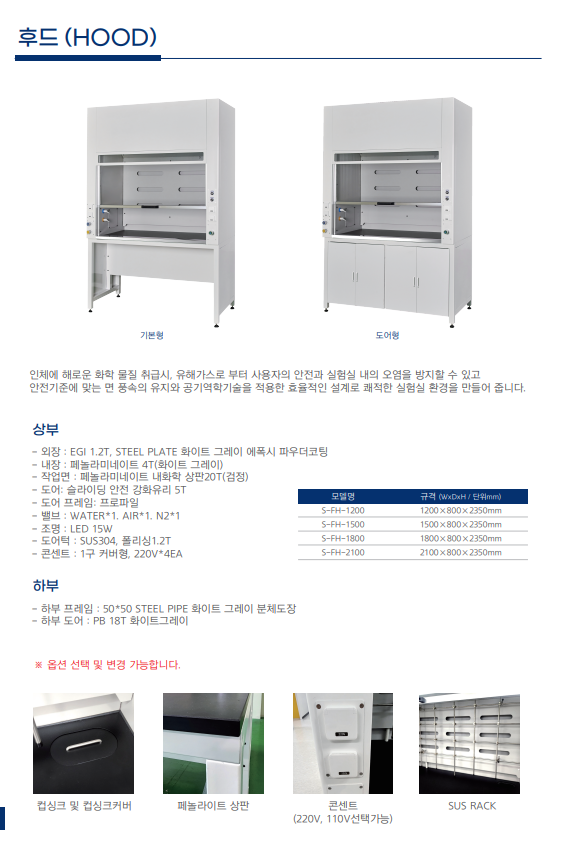 인체에 해로운 화학 물질 취급시, 유해가스로 부터 사용자의 안전과 실험실 내의 오염을 방지할 수 있고 안전기준에 맞는 면 풍속의 유지와 공기역학기술을 적용한 효율적인 설계로 쾌적한 실험실 환경을 만들어 줍니다.