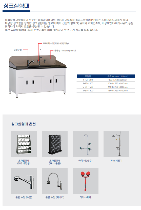 내화학성,내약품성이 우수한 “페놀라미네이트”상판과 내부식성 폴리프로필렌(P.P)또는 스테인레스,에폭시 등의 대용량 싱크볼을 장착한 싱크실험대는 필요에 따라 선반의 형태 및 위치와 초자건조대, 비상세안기(아이샤워기)등을 장착하여 최적의 조건을 구성할 수 있습니다. 또한 Waterguard (소재-안전강화유리)를 설치하여 주변 기기 장치를 보호 합니다.